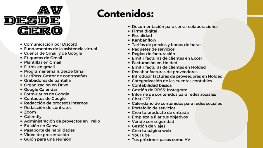 Si ya tienes conocimientos previos para desarrollar tareas administrativas, atención al cliente o contabilidad, AV Desde Cero te ayudará a saber hacerlo todo de forma remota y a posicionarte como referente en el sector.